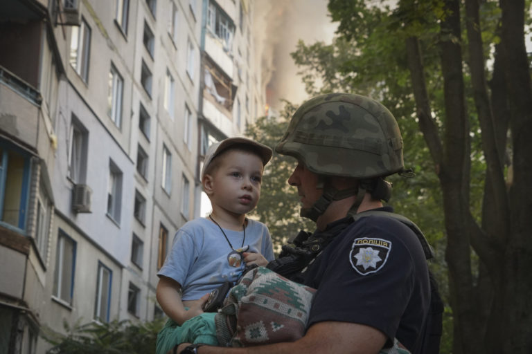 Policajt drží na rukách chlapčeka, ktorý prežil ruský útok na Charkov. Foto: SOTA/AP.
