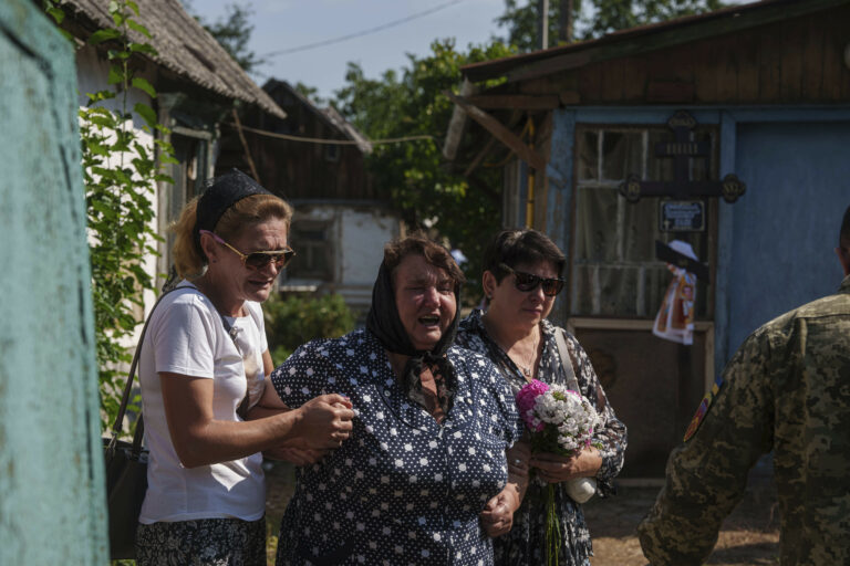 Matka zosnulého ukrajinského vojaka plače počas pohrebnej ceremónie. Štvrtok, 1. august, 2024. Foto: SITA/AP