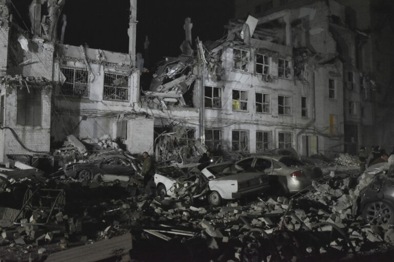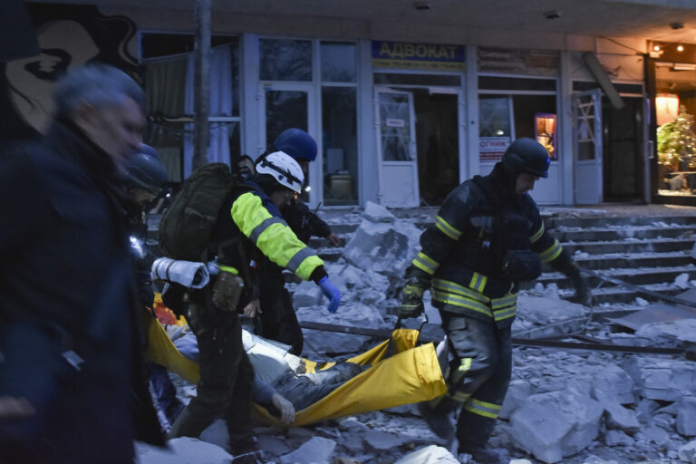 Záchranári vyťahujú z trosiek ľudí po ruskom útoku na Záporožie. Foto: SITA/AP.