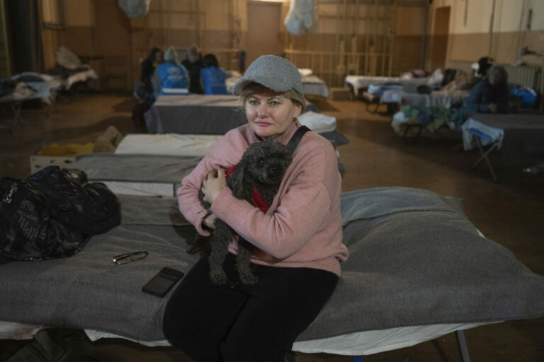 Iryna Prohoda z Pokrovska sedí na posteli v Mestskom divadle v Pavlohrade v Dnepropetrovskej oblasti na Ukrajine, kde prespávajú utečenci. Foto: SITA/AP.