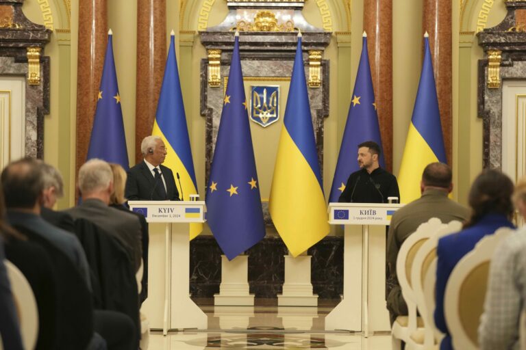Ukrajinský prezident Volodymyr Zelenskyj (uprostred vpravo) a predseda Európskej rady Antonio Costa počas spoločnej tlačovej konferencie v Kyjeve. Foto: SITA/AP
