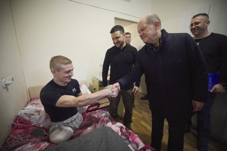 Nemecký kancelár Olaf Scholz a ukrajinský prezident Volodymyr Zelenskyj navštevujú zranených vojakov vo vojenskej nemocnici v Kyjeve. Foto: Ukrainian Presidential Press Office via AP