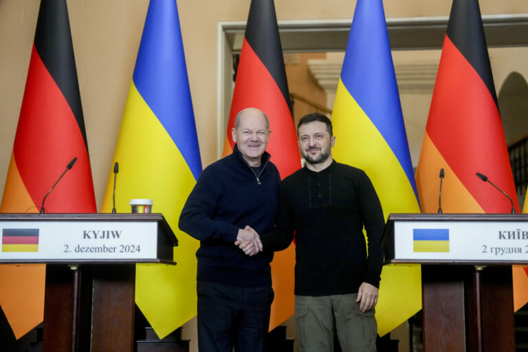 Ukrajinský prezident Volodymyr Zelenskyj (vpravo) a nemecký kancelár Olaf Scholz na tlačovej konferencii v Kyjeve. Foto: SITA/AP
