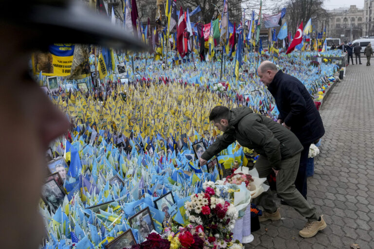 Ukrajinský prezident Volodymyr Zelenskyj (vpravo) a nemecký kancelár Olaf Scholz na ceremónii na počesť padlých vojakov. Foto: SITA/AP