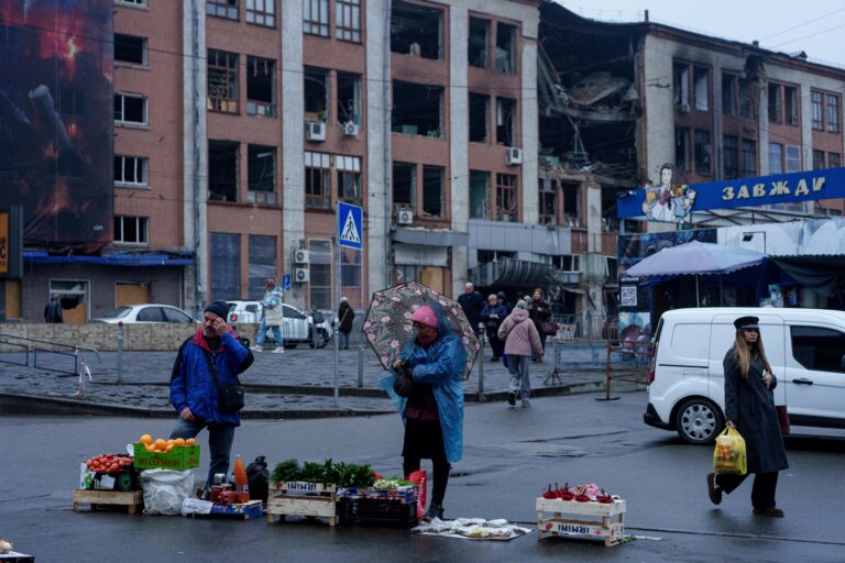 Ľudia predávajú potraviny na trhu pred budovou poškodenou ruským útokom v Kyjeve na Ukrajine v pondelok 1. decembra 2025. Foto: SITA/AP
