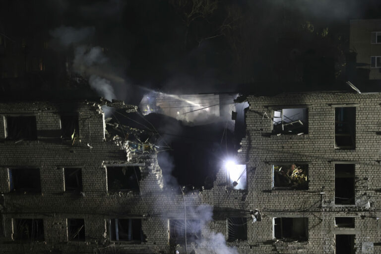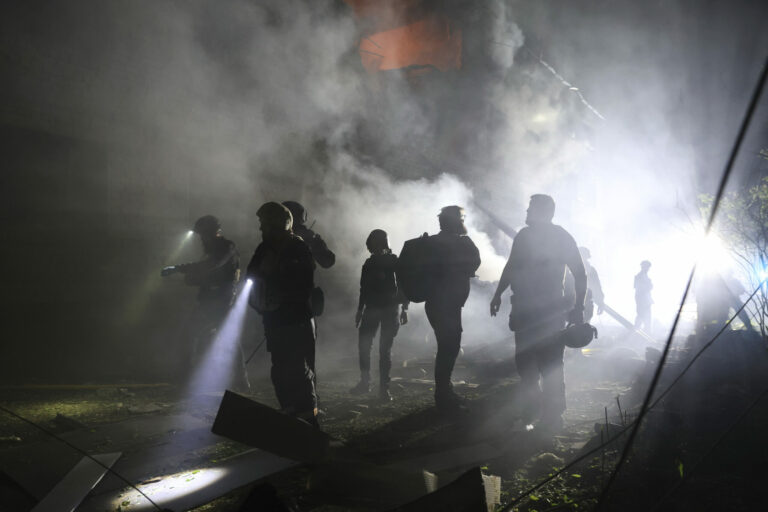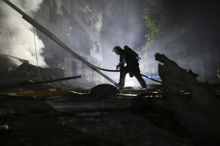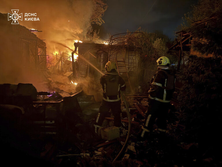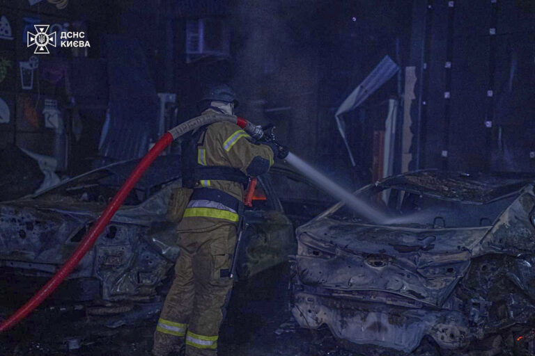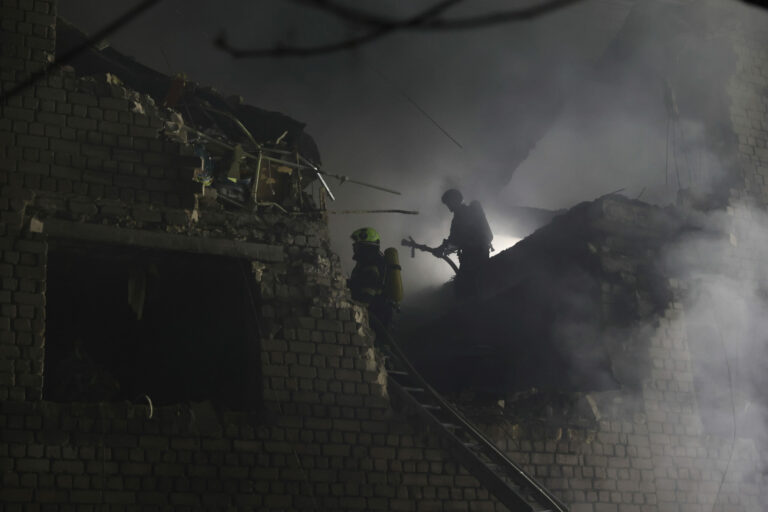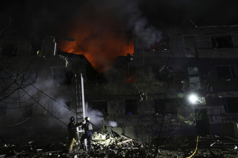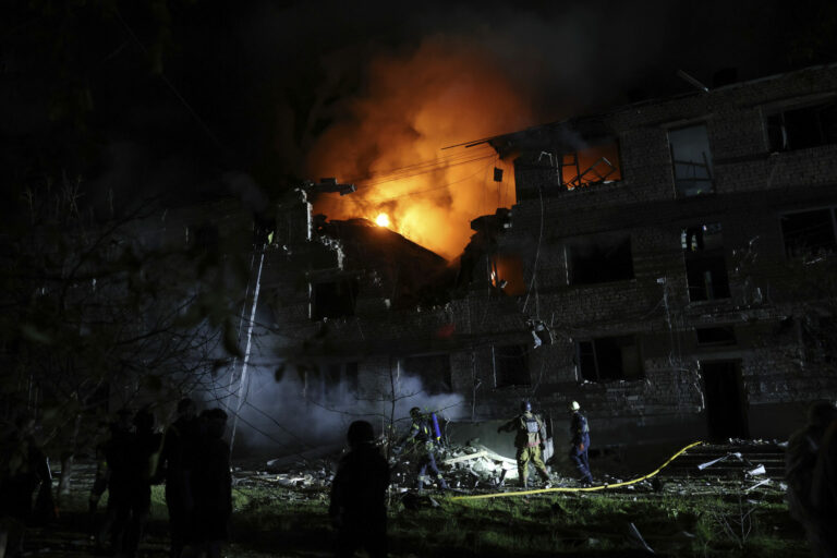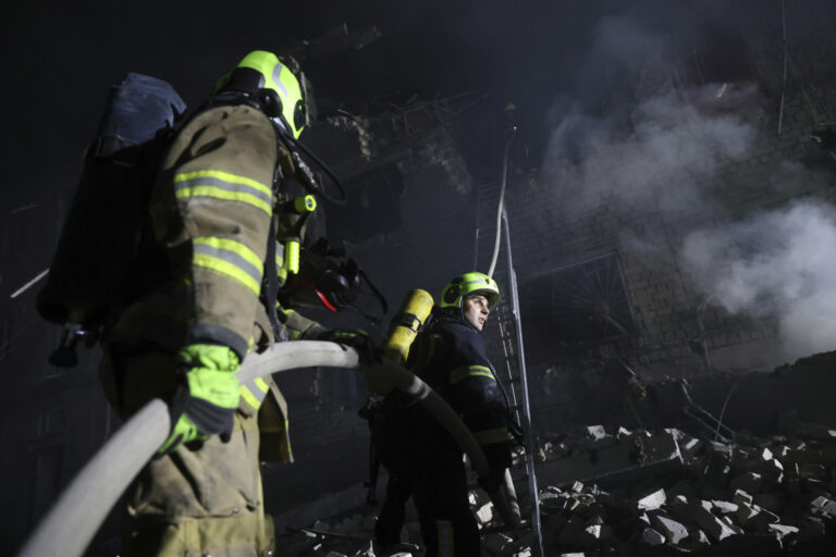 Na snímke poskytnutej ukrajinskou záchrannou službou pracovníci záchrannej služby pracujú na hasení požiaru po ruskom útoku v Kyjeve, Ukrajina, v nedeľu 4. mája 2025. Foto: Ukrainian Emergency Service via AP