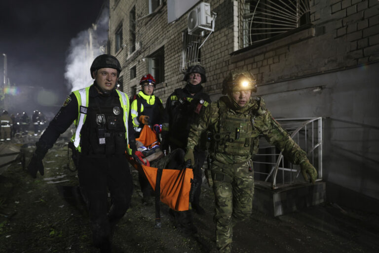 Policajti nesú na nosidlách zraneného muža po ruskom útoku na obytnú štvrť v Záporožskej oblasti na Ukrajine vo štvrtok 1. mája 2025. Foto: SITA/AP