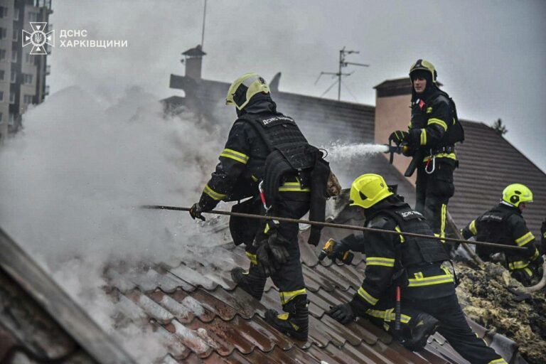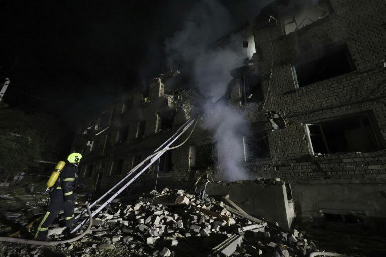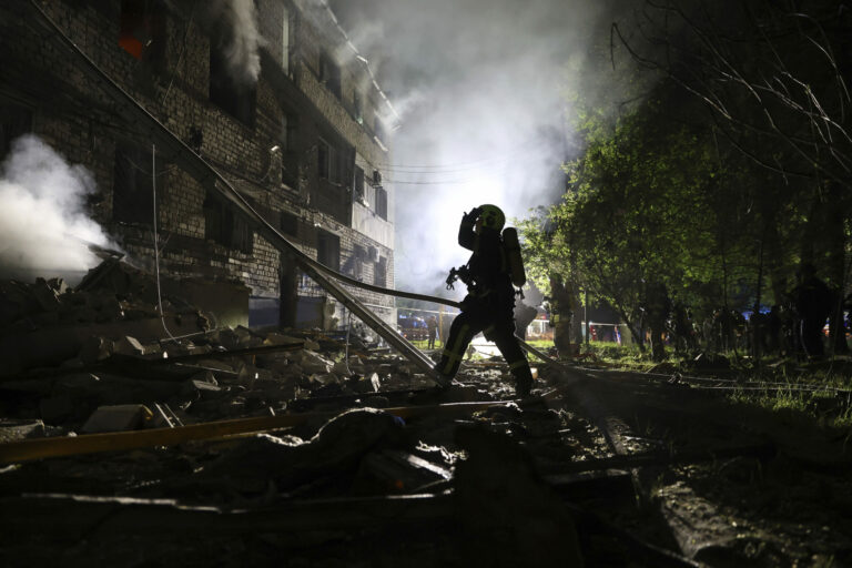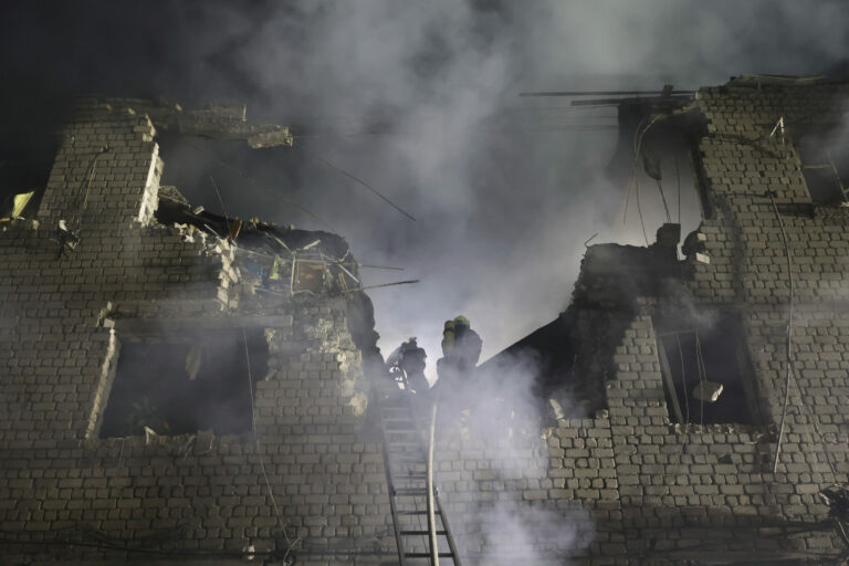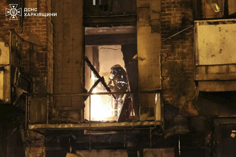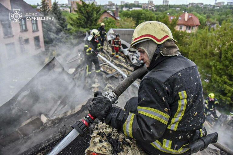 Na snímke, ktorú poskytla ukrajinská záchranná služba v utorok 6. mája 2025, záchranári hasia požiar v budove, ktorá bola vážne poškodená ruským útokom na Charkov na Ukrajine. Foto: Ukrainian Emergency Service via AP