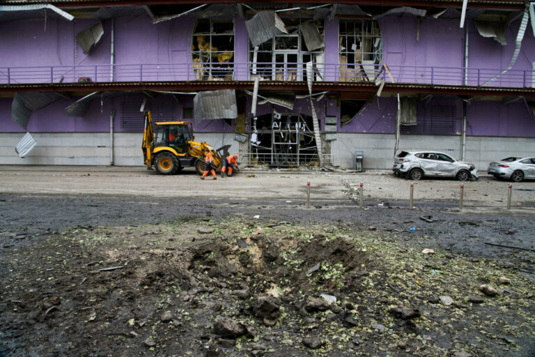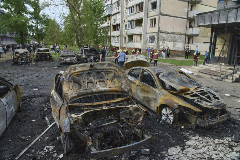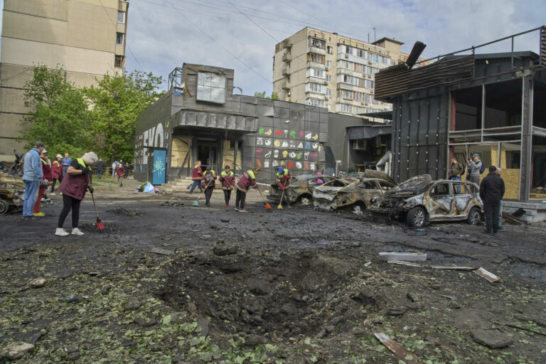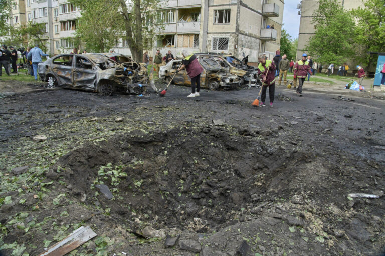 Komunálni pracovníci upratujú v blízkosti zhorených áut a krátera, ktorý vytvoril dron v obytnej štvrti po ruskom nálete v Kyjeve na Ukrajine v nedeľu 4. mája 2025. Foto: SITA/AP