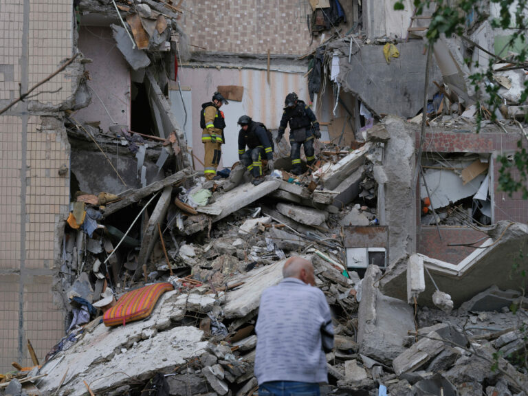 Na snímke, ktorú poskytla tlačová služba 93. ukrajinskej samostatnej mechanizovanej brigády Cholodnyj Jar, muž sa pozerá na viacposchodovú obytnú budovu zničenú ruským náletom v ukrajinskej Kostiantynivke vo štvrtok 8. mája 2025. Foto: Iryna Rybakova/Ukraine's 93rd Mechanized Brigade via AP