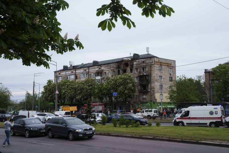Obytná budova je poškodená po ruskom útoku v Kyjeve na Ukrajine v stredu 7. mája 2025. Foto: SITA/AP