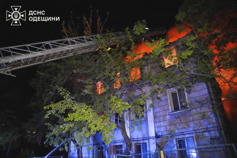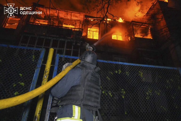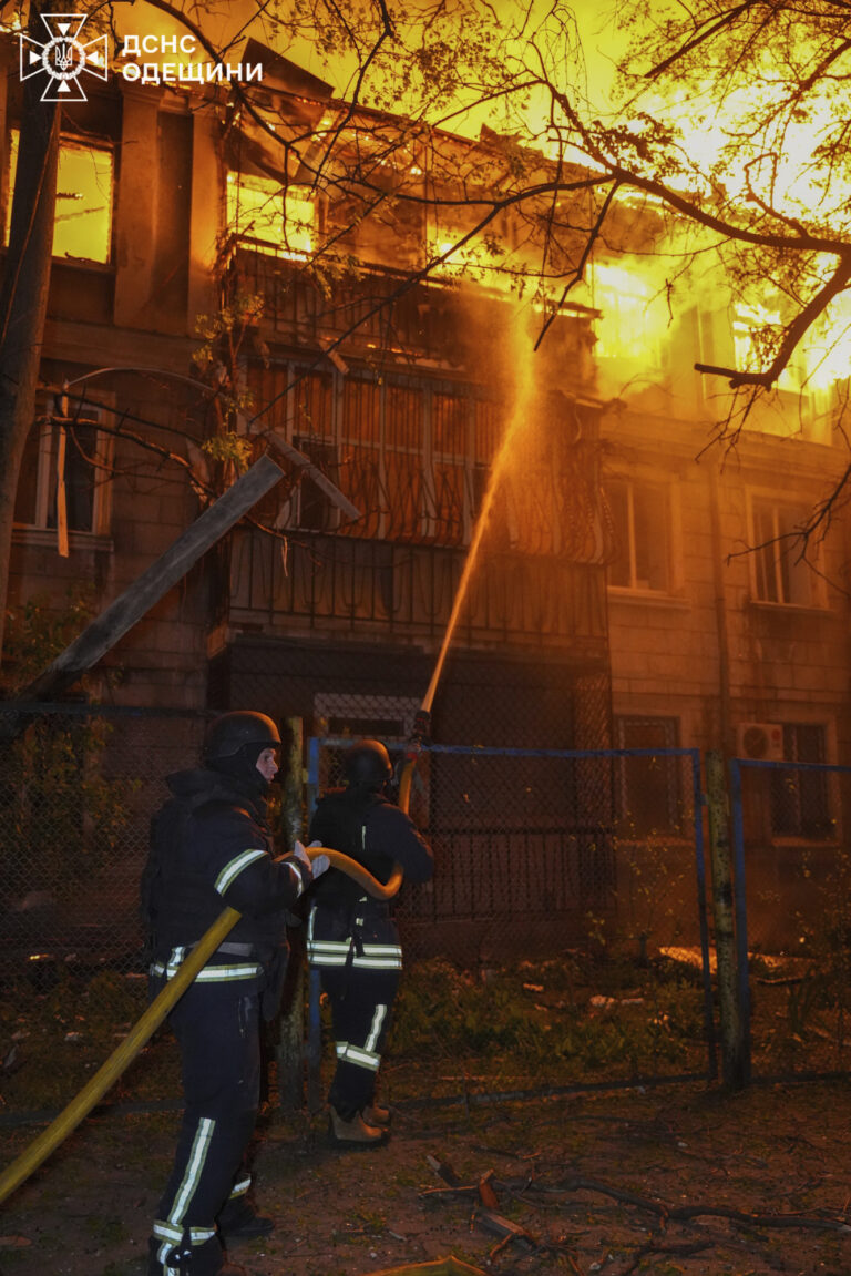 Na snímke ukrajinskej pohotovostnej služby hasiči hasia požiar v obytnom dome po ruskom nálete v Odese na Ukrajine vo štvrtok 1. mája 2025. Foto: Ukrainian Emergency Service via AP