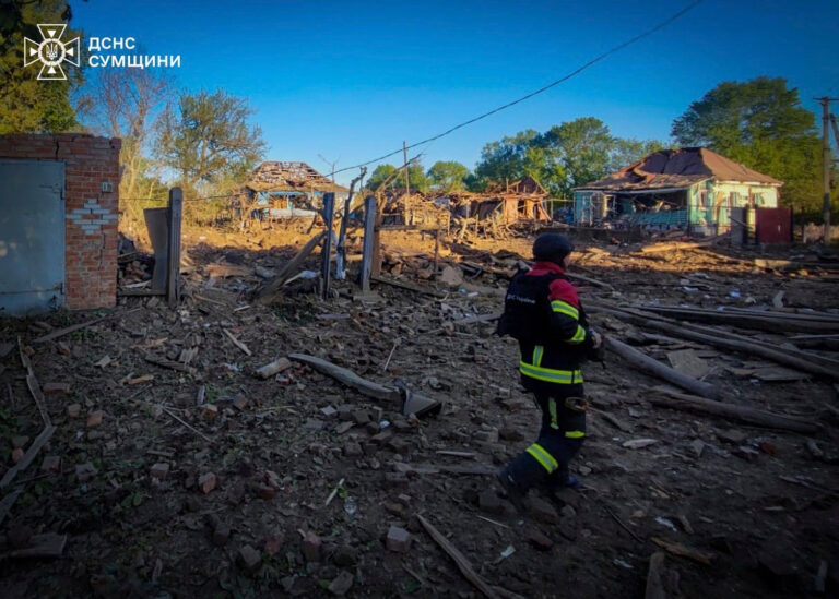 Na snímke poskytnutej ukrajinskou záchrannou službou 8. mája 2025 záchranár kráča po dvore obytných budov zničených ruským úderom v Sumskej oblasti na Ukrajine. Foto: Ukrainian Emergency Service via AP