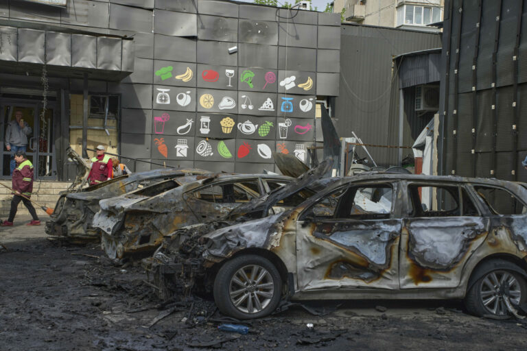 Komunálni pracovníci čistia okolie zhorených áut v obytnej štvrti po útoku ruského dronu v Kyjeve na Ukrajine v nedeľu 4. mája 2025. Foto: SITA/AP