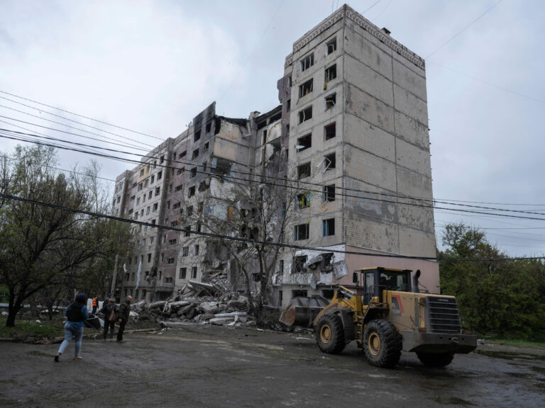 Na snímke, ktorú poskytla tlačová služba 93. ukrajinskej samostatnej mechanizovanej brigády Cholodnyj Jar, traktor odstraňuje trosky viacposchodovej obytnej budovy, ktorú zničil ruský nálet, v ukrajinskej Kostiantynivke vo štvrtok 8. mája 2025. Foto: Iryna Rybakova/Ukraine's 93rd Mechanized Brigade via AP