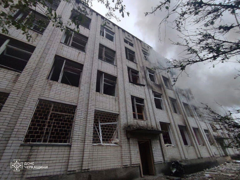 Na snímke poskytnutej ukrajinskou pohotovostnou službou 7. mája 2025 dym stúpa z budovy poškodenej ruským útokom v ukrajinskom meste Uman. Foto: Ukrainian Emergency Service via AP
