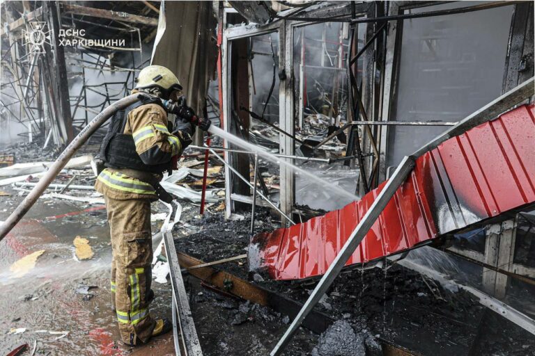 Na snímke ukrajinskej pohotovostnej služby pracovníci záchrannej služby pracujú na hasení požiaru po ruskom útoku v Charkove na Ukrajine v sobotu 3. mája 2025. Foto: Ukrainian Emergency Service via AP