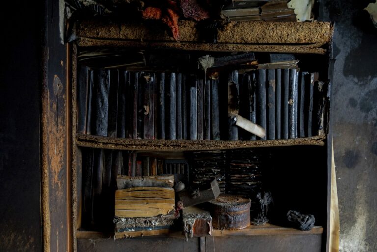 Vyhorené knihy v byte v obytnom dome poškodenom po ruskom útoku v Kyjeve na Ukrajine v stredu 7. mája 2025. Foto: SITA/AP