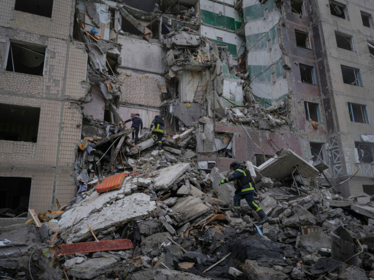 Na snímke, ktorú poskytla tlačová služba 93. ukrajinskej samostatnej mechanizovanej brigády Cholodnyj Jar, záchranári odstraňujú trosky viacposchodovej obytnej budovy zničenej ruským náletom v ukrajinskej Kostiantynivke vo štvrtok 8. mája 2025. Foto: Iryna Rybakova/Ukraine's 93rd Mechanized Brigade via AP