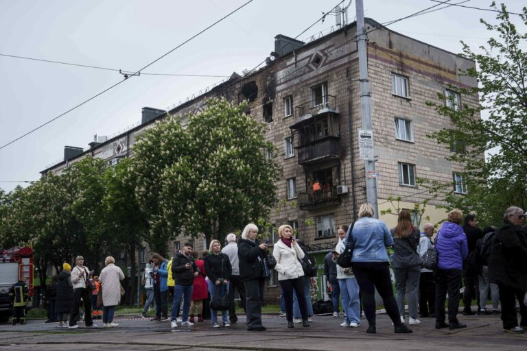 Miestni obyvatelia čakajú na električku pred obytným domom, ktorý bol poškodený po ruskom útoku, v Kyjeve na Ukrajine v stredu 7. mája 2025. Foto: SITA/AP