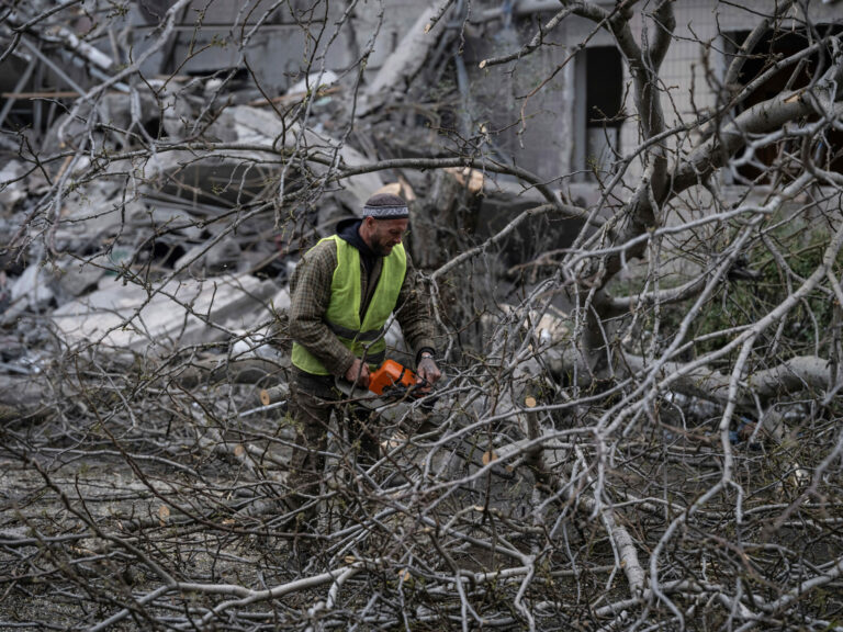 Na snímke, ktorú poskytla tlačová služba 93. ukrajinskej samostatnej mechanizovanej brigády Cholodnyj Jar, muž reže strom pred viacposchodovou obytnou budovou zničenou ruským náletom v ukrajinskej Kostiantynivke vo štvrtok 8. mája 2025. Foto: Iryna Rybakova/Ukraine's 93rd Mechanized Brigade via AP