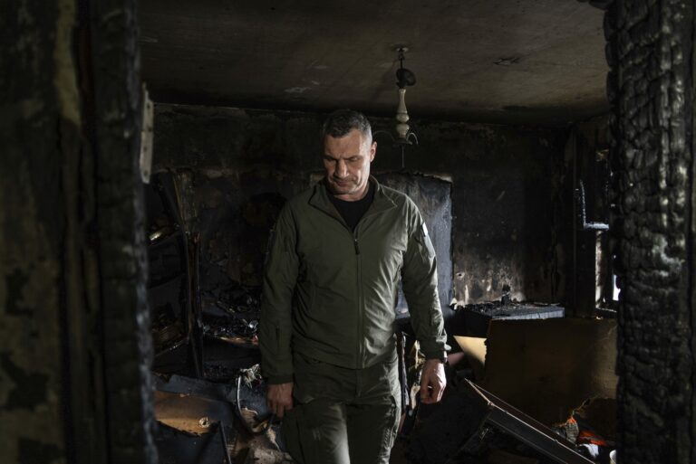 Starosta mesta Vitalij Kličko pozoruje vyhorený byt v obytnom dome poškodenom po ruskom útoku v Kyjeve na Ukrajine v stredu 7. mája 2025. Foto: SITA/AP