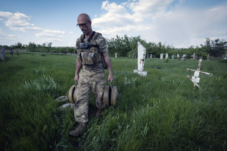 Ukrajinský sapér nosí míny po tom, čo vo štvrtok 2. mája 2024 vyčistil cintorín od mín na mieste ťažkých bojov s ruskými jednotkami v obci Krasnopillya, Donecká oblasť, Ukrajina. Foto: SITA/AP
