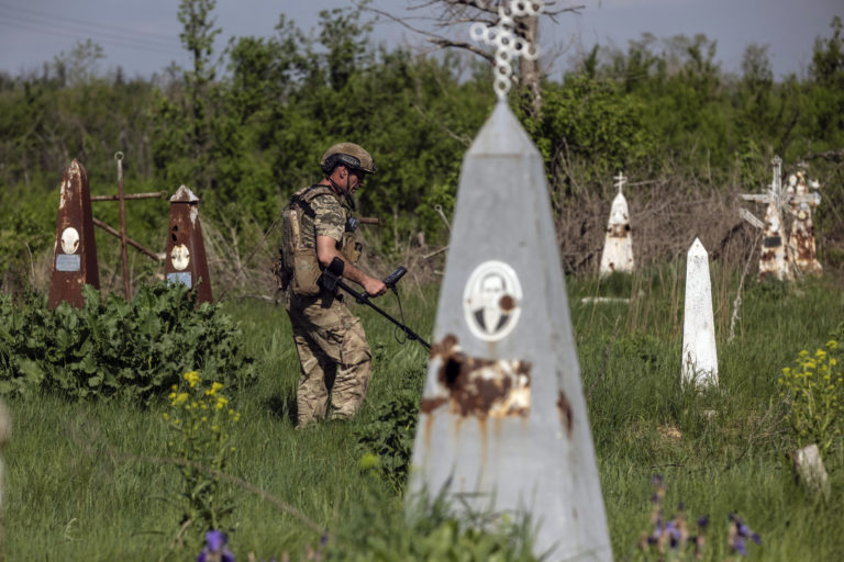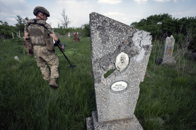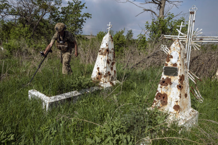 Ukrajinský sapér odmínováva vo štvrtok 2. mája 2024 cintorín na mieste ťažkých bojov s ruskými jednotkami v obci Krasnopillya v Doneckej oblasti na Ukrajine. Foto: SITA/AP
