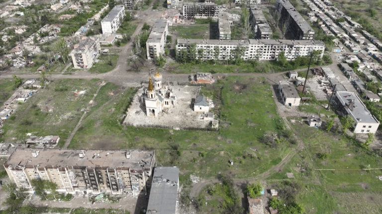 Táto fotografia prevzatá z videa z dronu, ktoré poskytla ukrajinská hliadková polícia, ukazuje devastáciu v Chasiv Jar, východoukrajinskom meste, na ktoré Rusko útočí. Foto: SITA/AP