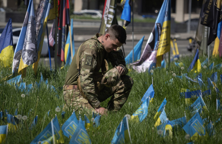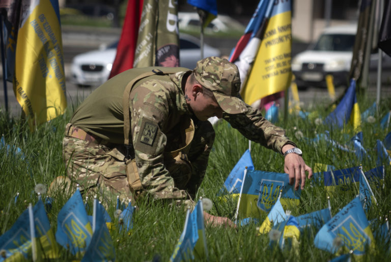 Na Námestí nezávislosti v Kyjeve na Ukrajine v stredu 1. mája 2024 kľačí vojak obklopený malými štátnymi vlajkami symbolizujúcimi ukrajinských vojakov zabitých vo vojne s Ruskom. Foto: SITA/AP