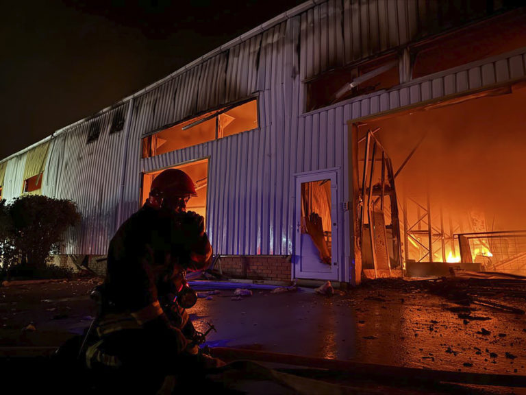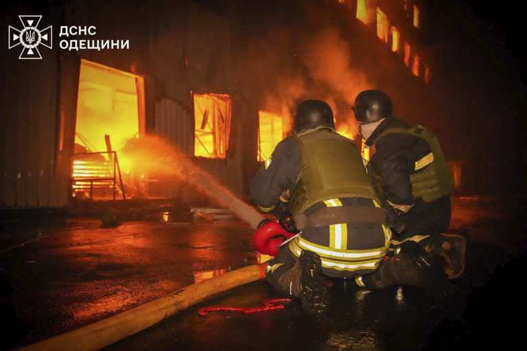 Na tejto fotografii, ktorú poskytla ukrajinská pohotovostná služba, pracovníci záchrannej služby pracujú na hasení požiaru po ruskom útoku v Odese na Ukrajine v stredu 1. mája 2024. Foto: SITA/AP