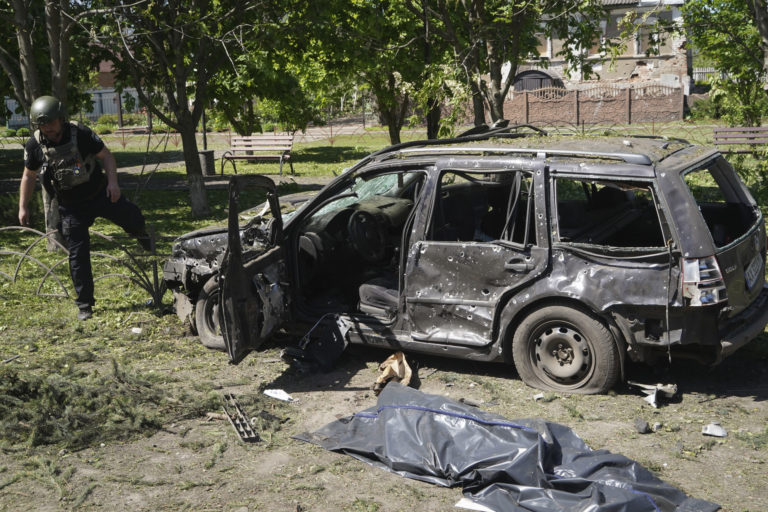 Telo muža zabitého pri ruskom nálete vidno v jeho aute Zoločiv, Charkovský región, Ukrajina, v stredu 1. mája 2024. Foto: SITA/AP