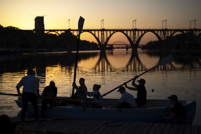 Miestni rybári hádžu svoje šnúry do rieky Dnipro, keď slnko zapadá za Dnipro na Ukrajine, štvrtok 2. mája 2024. Foto: SITA/AP