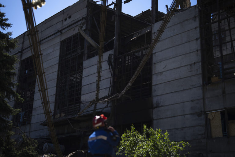 Príslušník štátnej pohotovostnej služby stojí vedľa trosiek v poškodenej tepelnej elektrárni DTEK po ruskom útoku na Ukrajine, štvrtok 2. mája 2024. Foto: SITA/AP