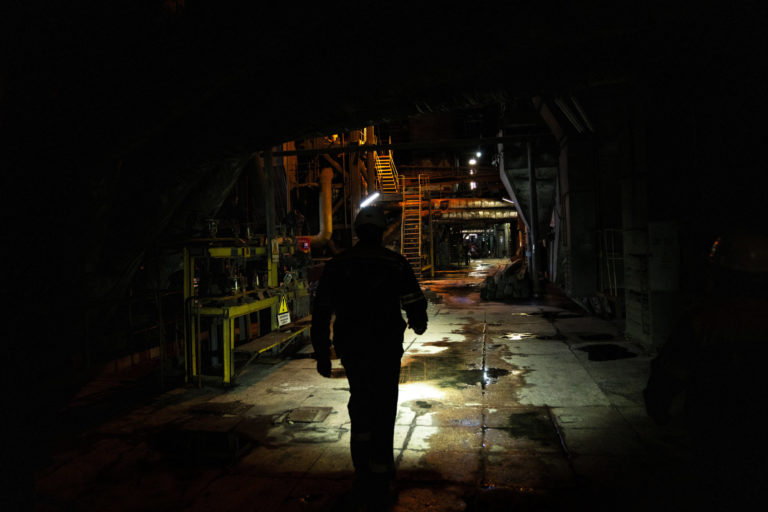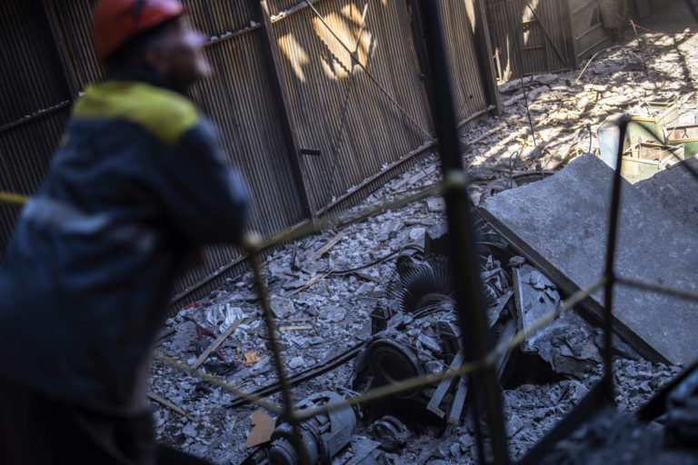 Robotník kráča po vnútornom koridore v poškodenej tepelnej elektrárni DTEK po ruskom útoku na Ukrajine, štvrtok 2. mája 2024. Foto: SITA/AP