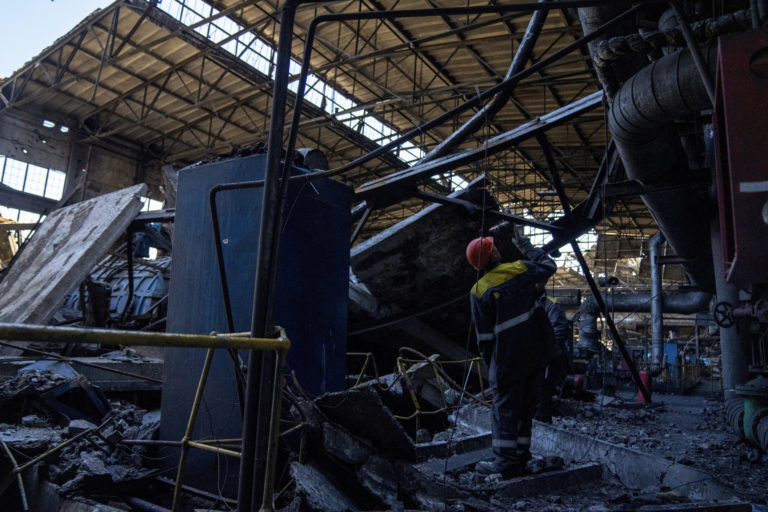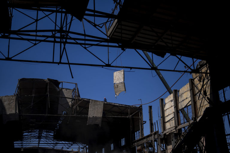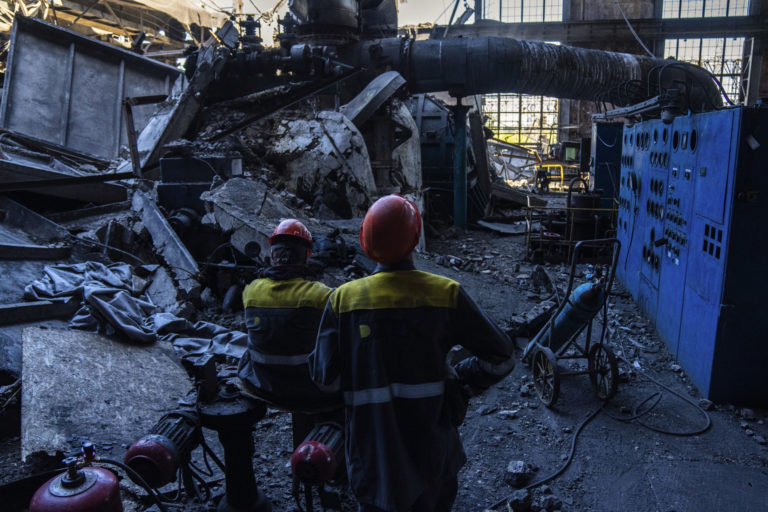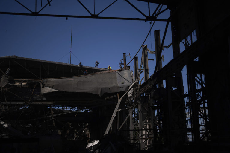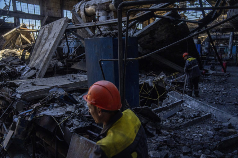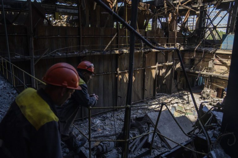 Robotníci kráčajú medzi troskami v poškodenej tepelnej elektrárni DTEK po ruskom útoku na Ukrajine, štvrtok 2. mája 2024. Foto: SITA/AP