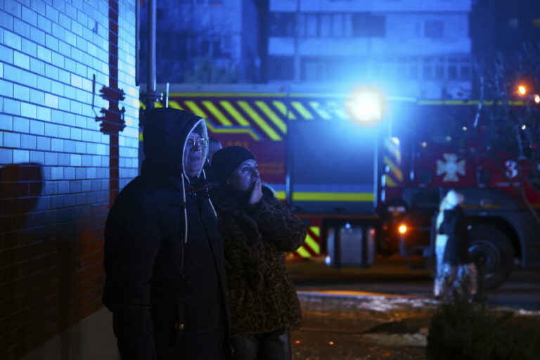 Miestni obyvatelia stoja pred horiacim domom, ktorý zasiahol útok ruského dronu na obytnú štvrť v Záporožskej oblasti na Ukrajine v sobotu 1. marca 2025. Foto: SITA/AP