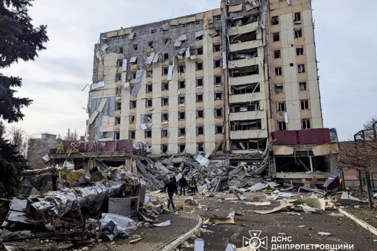 Na snímke ukrajinskej pohotovostnej služby sú poškodené obytné budovy po zásahu ruskou raketou v ukrajinskom meste Kryvyj Rih v stredu 12. marca 2025. Foto: Ukrainian Emergency Service via AP