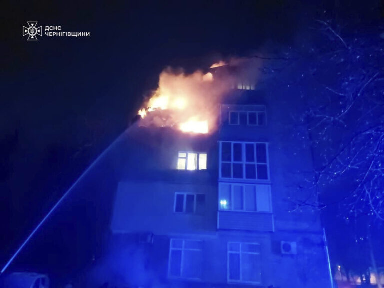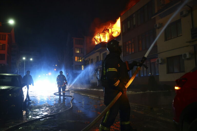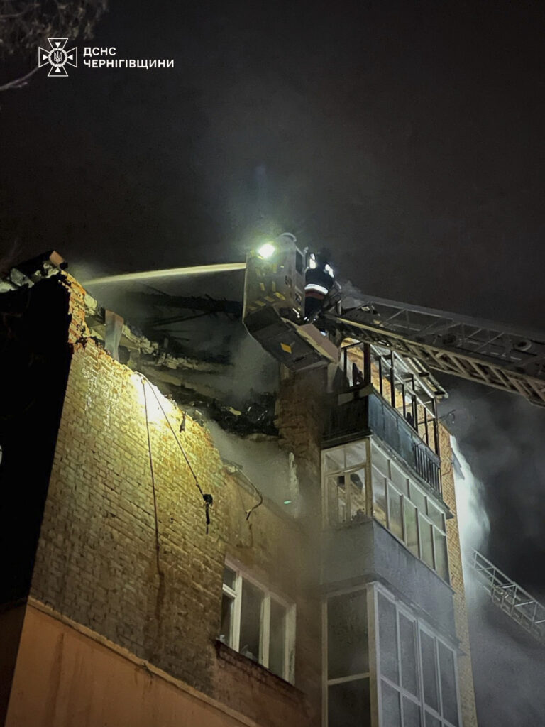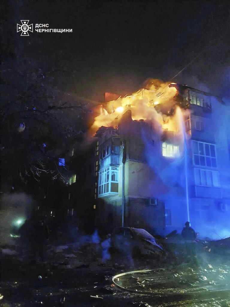 Na snímke ukrajinskej pohotovostnej služby hasiči hasia požiar v obytnom dome po útoku ruského dronu v ukrajinskom Černihove v nedeľu 16. marca 2025. Foto: Ukrainian Emergency Service via AP
