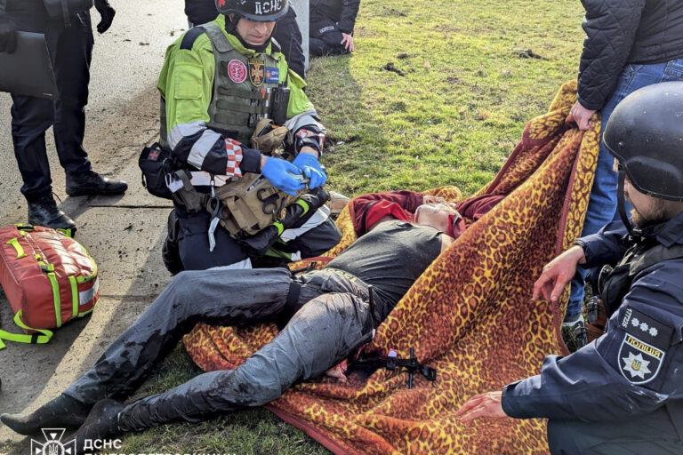 Na snímke ukrajinskej pohotovostnej služby zdravotníci ošetrujú zraneného muža po zásahu ruskou raketou v ukrajinskom meste Kryvyj Rih v stredu 12. marca 2025. Foto: Ukrainian Emergency Service via AP