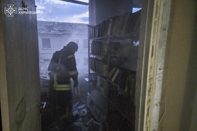 Na snímke ukrajinskej pohotovostnej služby hasiči hasia požiar na lýceu po útoku ruského dronu v Bohoduchove v Charkovskej oblasti na Ukrajine v sobotu 15. marca 2025. Foto: Ukrainian Emergency Service via AP