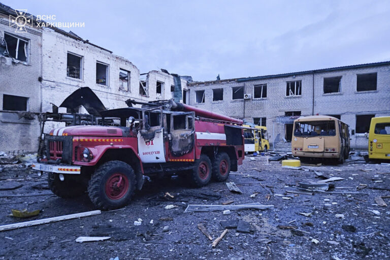 Na snímke poskytnutej ukrajinskou pohotovostnou službou horí hasičské auto a školské autobusy po zásahu ruským dronom, keď hasiči hasili požiar na lýceu po útoku ruského dronu v Bohoduchove v Charkovskej oblasti na Ukrajine v sobotu 15. marca 2025. Foto: Ukrainian Emergency Service via AP