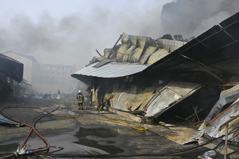 Na snímke ukrajinskej pohotovostnej služby hasiči hasia požiar po ruskom raketovom útoku v Charkove na Ukrajine v piatok 7. marca 2025. Foto: Ukrainian Emergency Service via AP