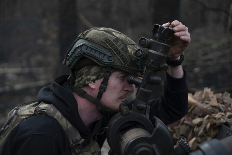 Ukrajinský vojak sa pozerá na oblohu a hľadá ruské bezpilotné lietadlá, keď sa pripravuje na streľbu z húfnice M777 na ruské pozície na frontovej línii pri Donecku, Ukrajina, pondelok 3. marca 2025. Foto: archívne, SITA/AP