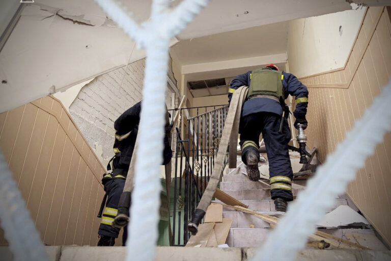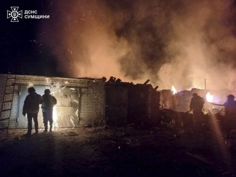 Na snímke poskytnutej ukrajinskou pohotovostnou službou vo štvrtok 13. marca 2025 hasiči pracujú na poškodenej budove po ruskom útoku v ukrajinskom meste Achtyrka. Foto: Ukrainian Emergency Service via AP