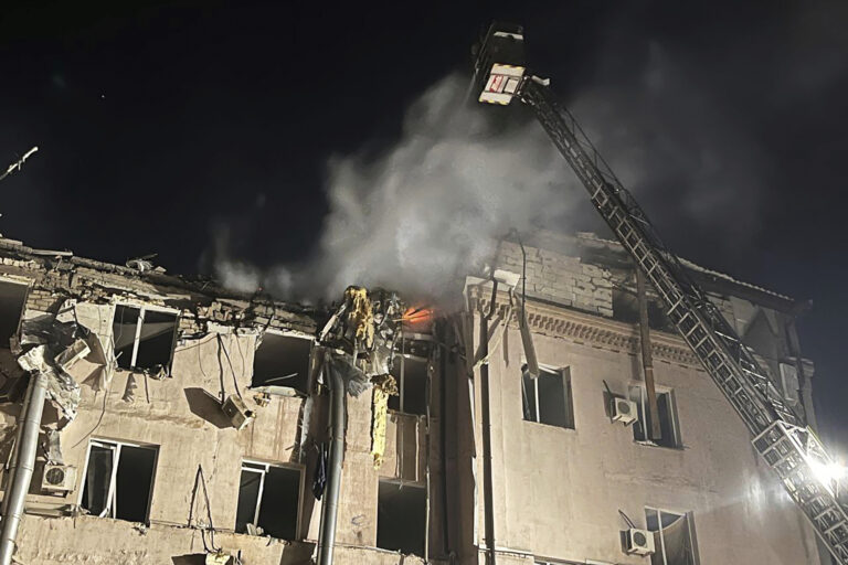 Na snímke poskytnutej ukrajinskou pohotovostnou službou vo štvrtok 13. marca 2025 hasiči hasia požiar poškodenej budovy po ruskom útoku v Kostiantynivke v Doneckej oblasti na Ukrajine. Foto: Ukrainian Emergency Service via AP