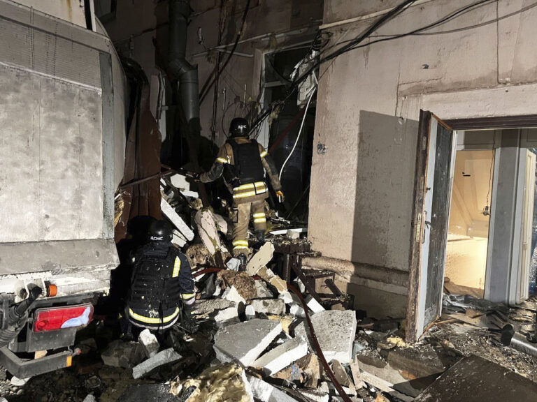 Na snímke, ktorú poskytol gubernátor Dnepropetrovskej oblasti Serhij Lysak, hasiči pracujú na mieste poškodenej budovy po útoku ruskou raketou v ukrajinskom meste Kryvyj Rih vo štvrtok 6. marca 2025. Foto: Dnipropetrovsk Oblast Governor Serhiy Lysak via AP