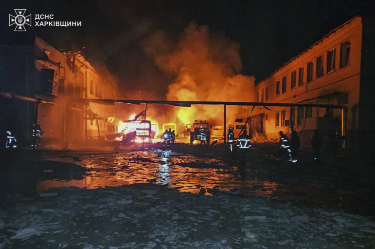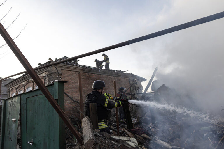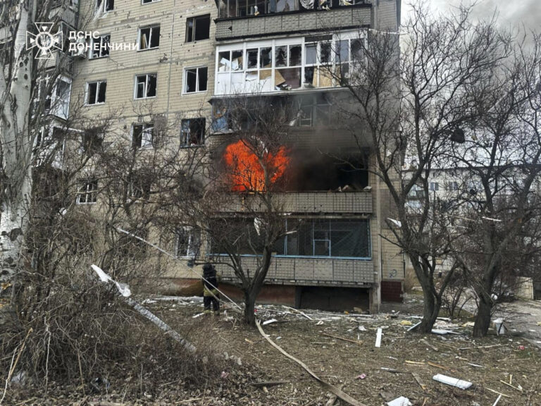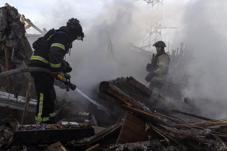 Na snímke ukrajinskej pohotovostnej služby hasiči hasia požiar po ruskom leteckom útoku v Kostiantynivke v Doneckej oblasti na Ukrajine v piatok 7. marca 2025. Foto: Ukrainian Emergency Service via AP