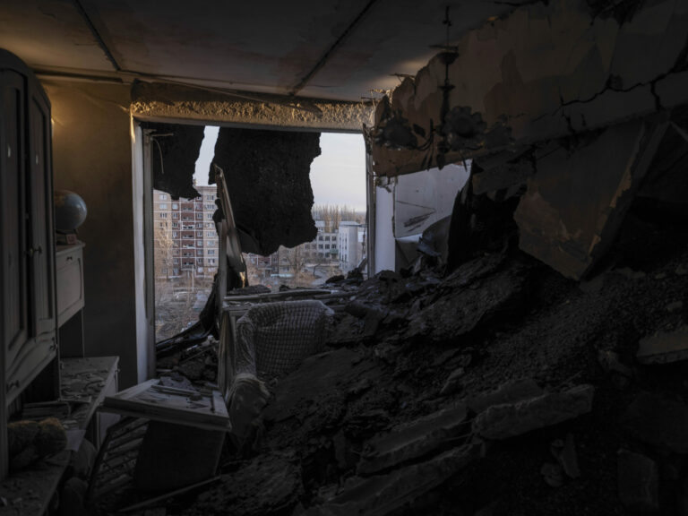 Na snímke, ktorú poskytla tlačová služba 93. ukrajinskej samostatnej mechanizovanej brigády Cholodnyj Jar, mesto Pokrovsk, miesto ťažkých bojov s ruskými jednotkami v Doneckej oblasti na Ukrajine, cez rozbité okno poškodeného bytu v nedeľu 9. marca 2025. Foto: Iryna Rybakova/Ukraine's 93rd Mechanized Brigade via AP
