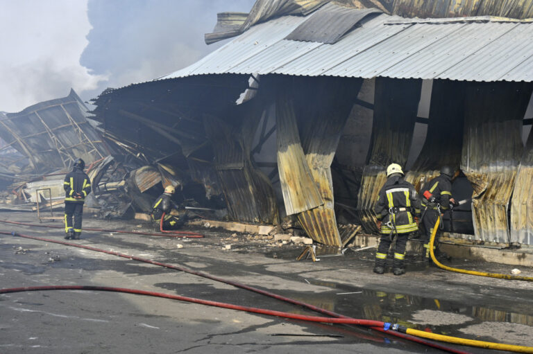 Hasiči hasia požiar po útoku ruského dronu, ktorý zasiahol sklady v ukrajinskej Odese v utorok 11. marca 2025. Foto: SITA/AP